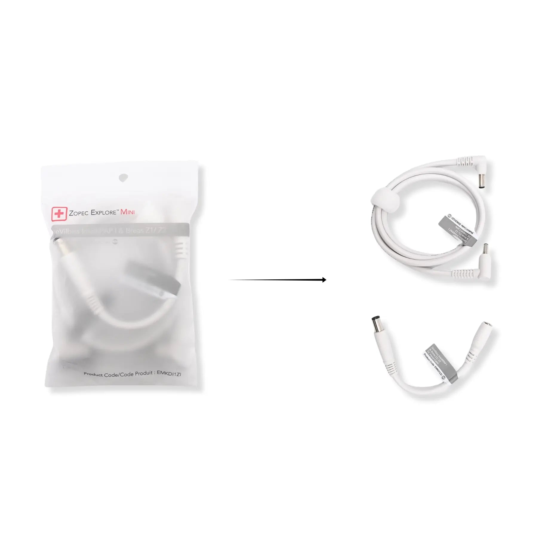 The DeVilbiss IntelliPAP I & Breas Z1 / Z2 Kit is a set of DC output and input cables that let you connect your CPAP device (DeVilbiss IntelliPAP I or Breas Z1 / Z2) to the Zopec Explore Mini battery.
