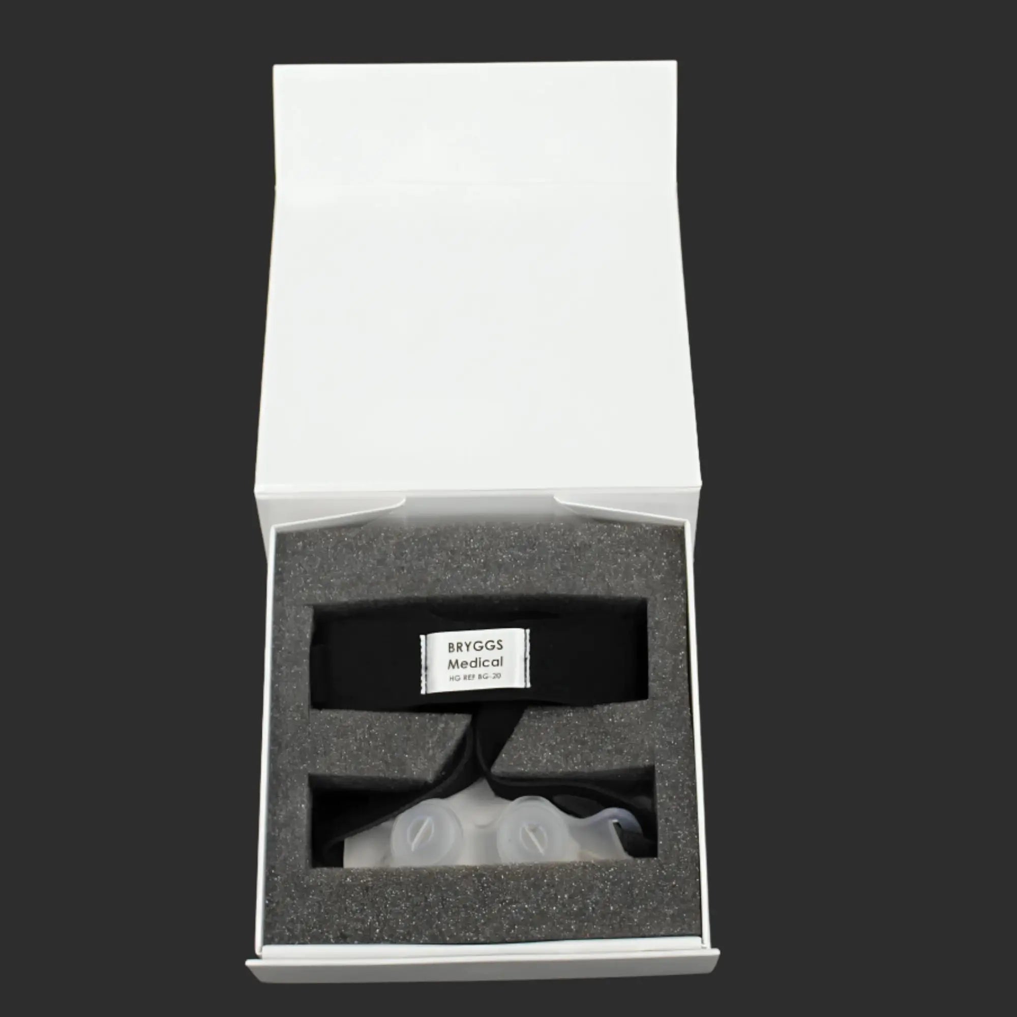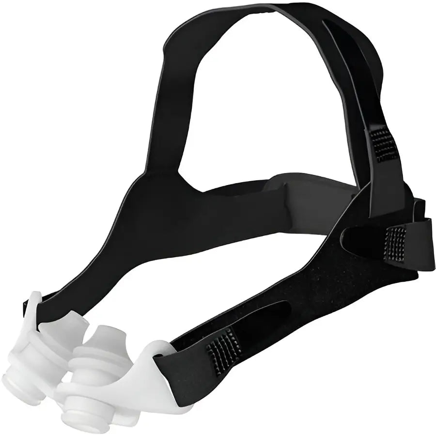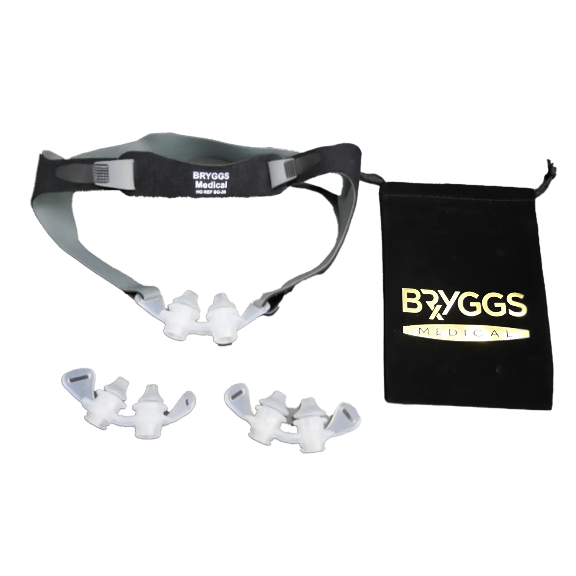 The device uses soft nasal cushions resting at the nostrils, held in place with lightweight elastic headgear. Cushions come in three sizes (small, medium, large). It is reusable and includes a travel case.